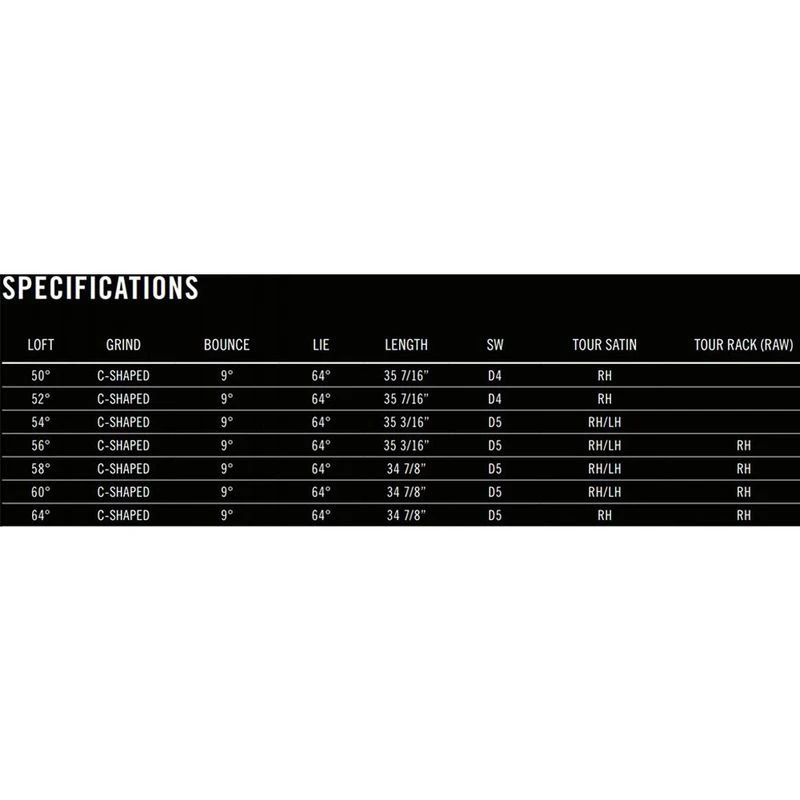 | Loft/Bounce | 50° Loft – 9° Bounce, 52° Loft – 9° Bounce, 54° Loft – 9° Bounce, 56° Loft – 9° Bounce, 58° Loft – 9° Bounce, 60° Loft – 9° Bounce, 64° Loft – 9° Bounce |
